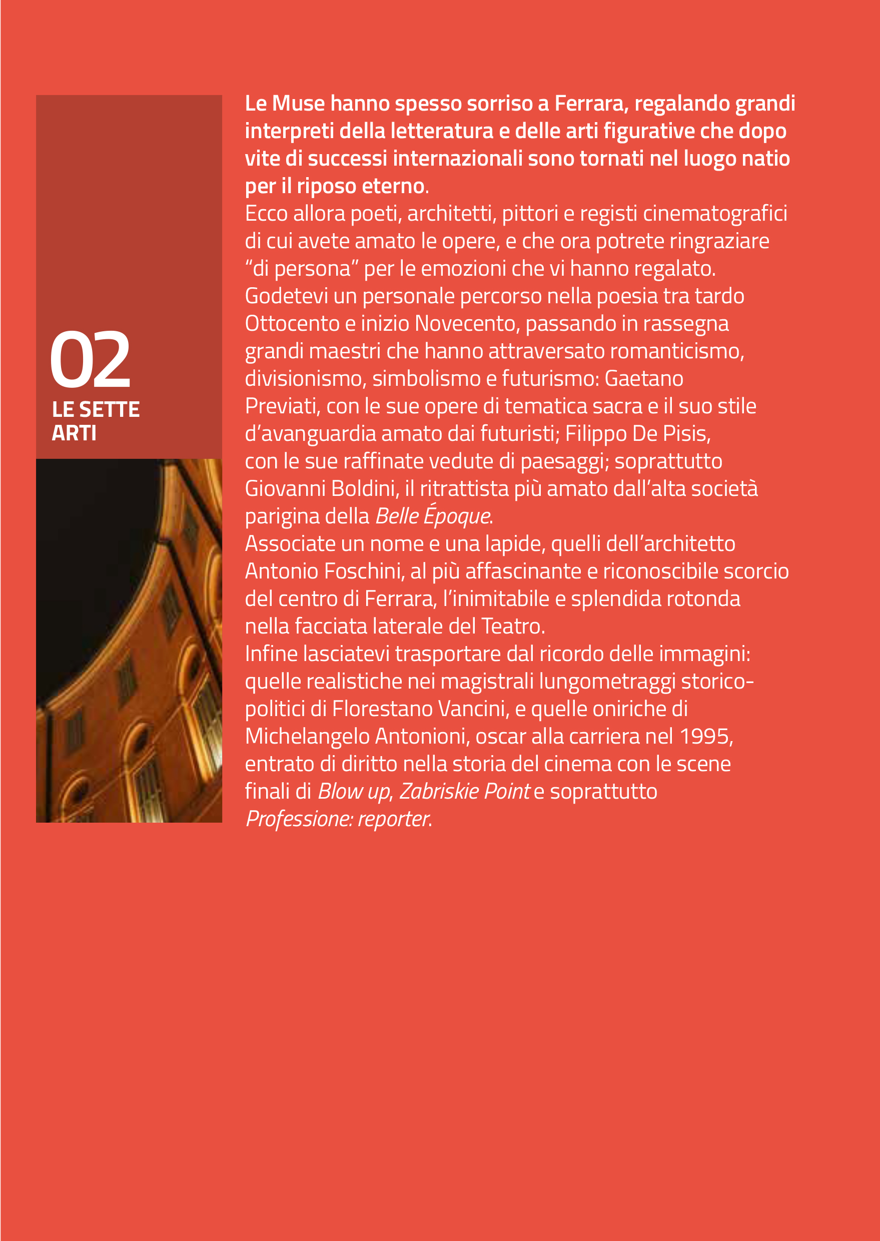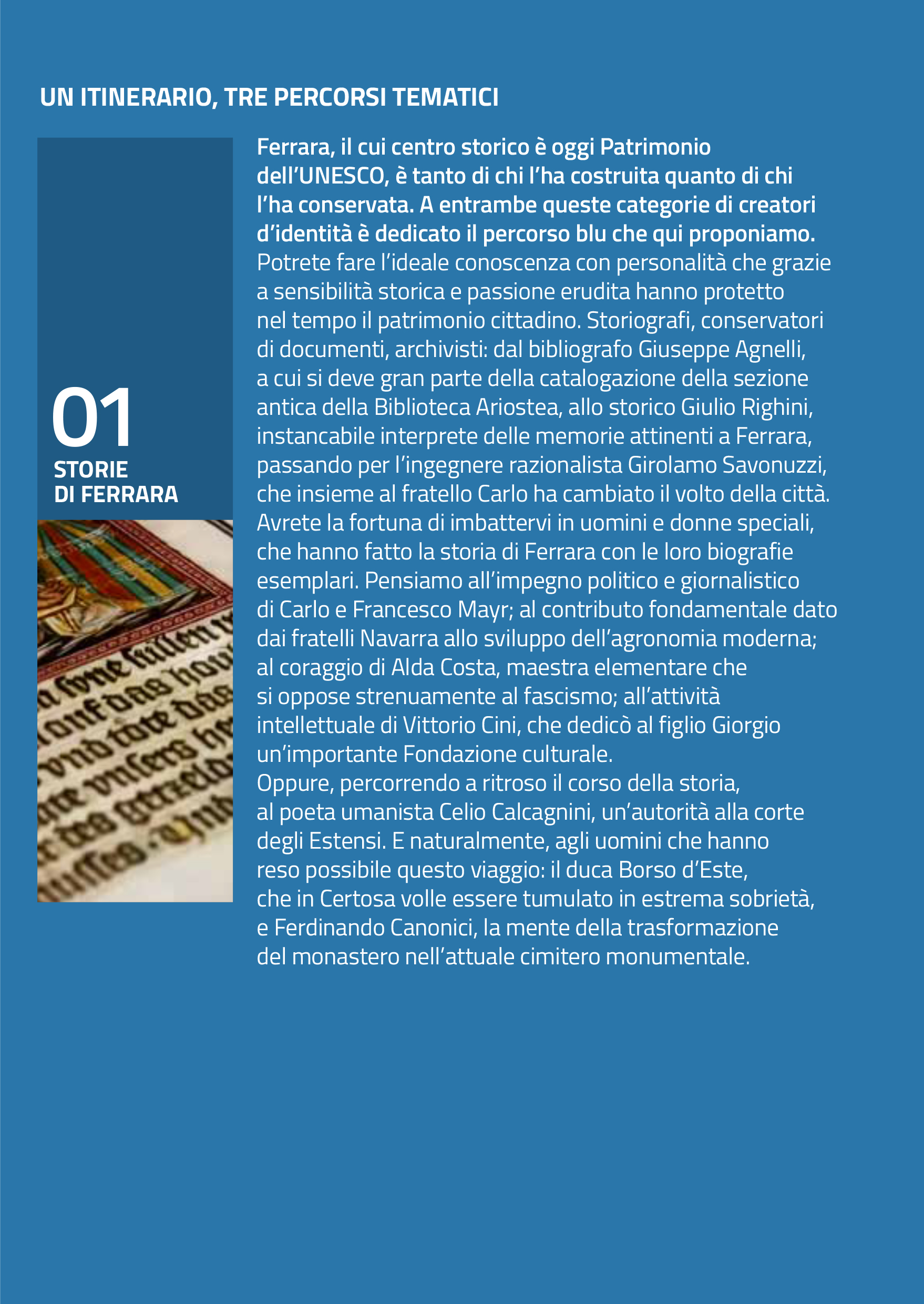 1. Storie di Ferrara, dedicato alle personalità che hanno contribuito a cementare con il loro percorso biografico e la loro attività professionale la storia della città, adatto ai tanti ferraresi che vogliano ripercorrere alcune tappe salienti dell’identità di Ferrara;