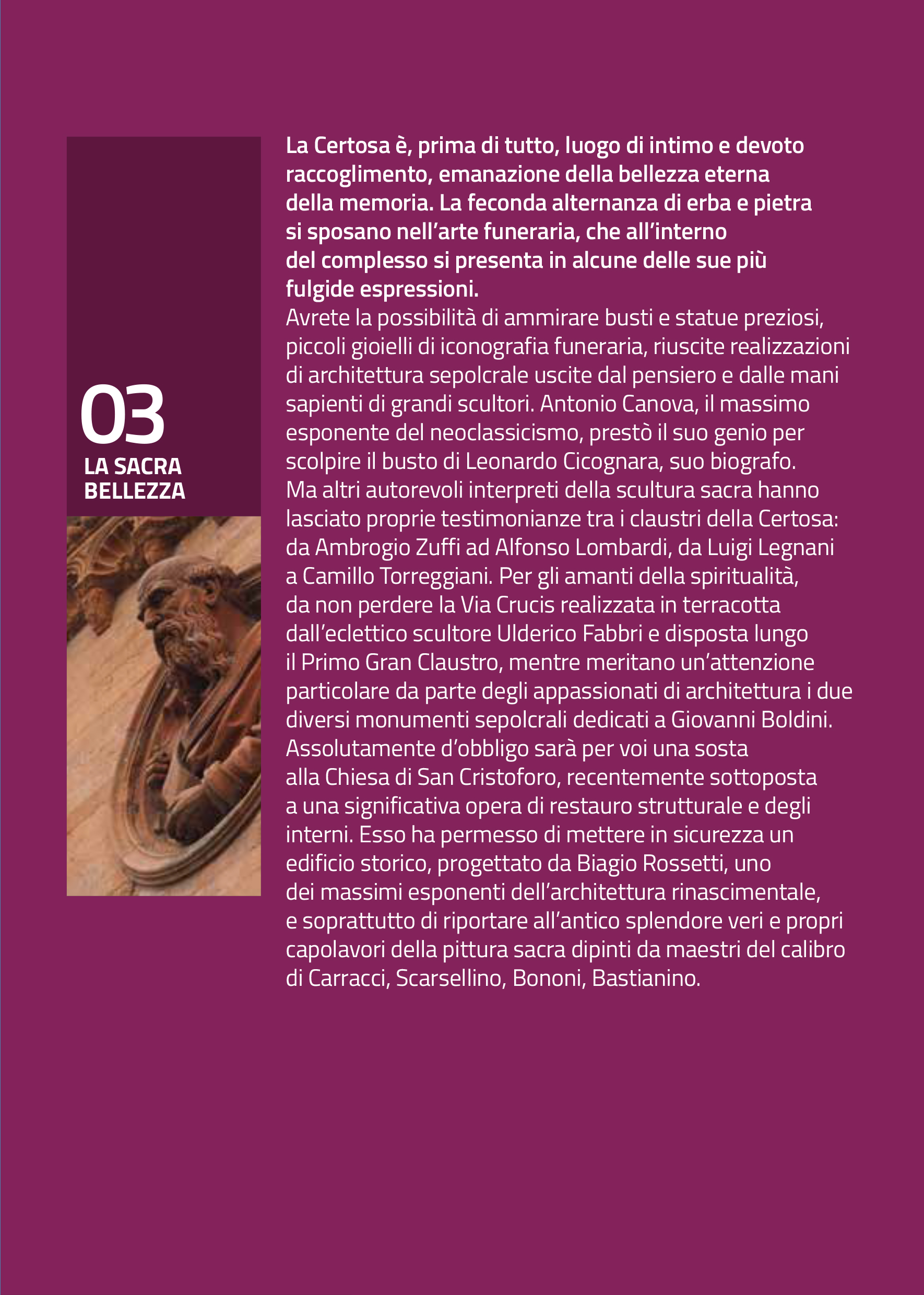 3. La sacra bellezza, ovvero una panoramica di sepolture preziose e altri elementi rilevanti di iconografia religiosa, perfetto per gli studiosi di arte figurativa e per tutti coloro che vogliano cogliere nella bellezza dei manufatti il rapporto tra immanente e trascendente.