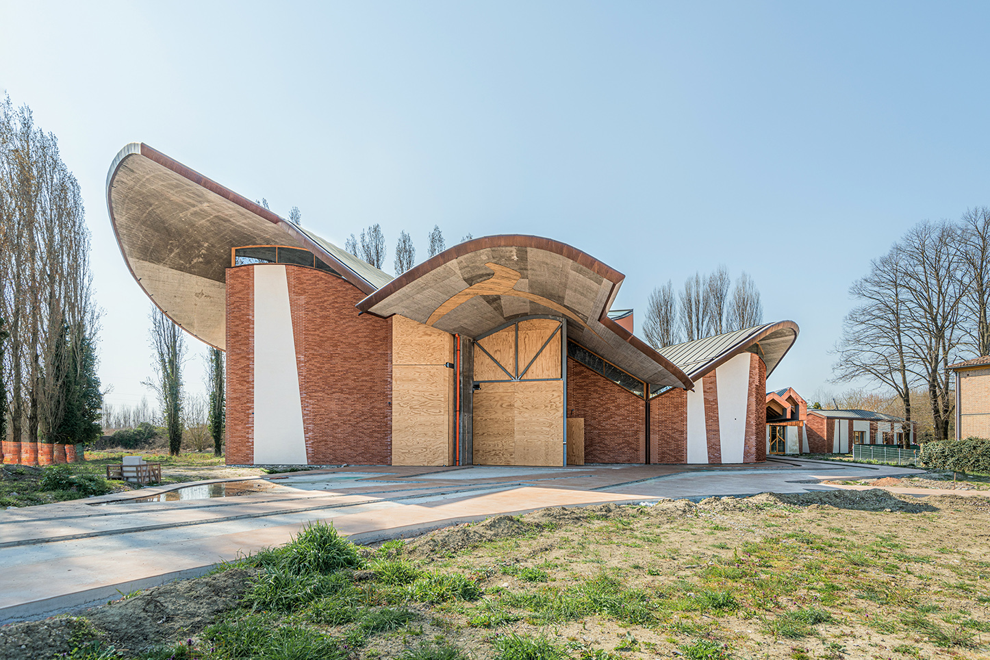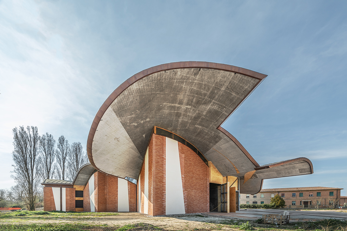 Costruito in uno spazio storico, nei pressi di una piccola canonica preesistente, il complesso di San Giacomo cattura l’attenzione già dall’esterno. L’edificio di culto si presenta scultoreo, con una volumetria e caratteri formali eccezionali, archetipi del ruolo sacro a cui è destinato. Al tempo stesso risulta amichevole e familiare, grazie all’uso in facciata del mattone, tipico elemento delle architetture di Ferrara, e alla sagoma del tetto organica e ondulata, ispirata alla natura anche nel materiale scelto, il legno, che conferisce una sensazione di leggerezza e benessere.