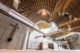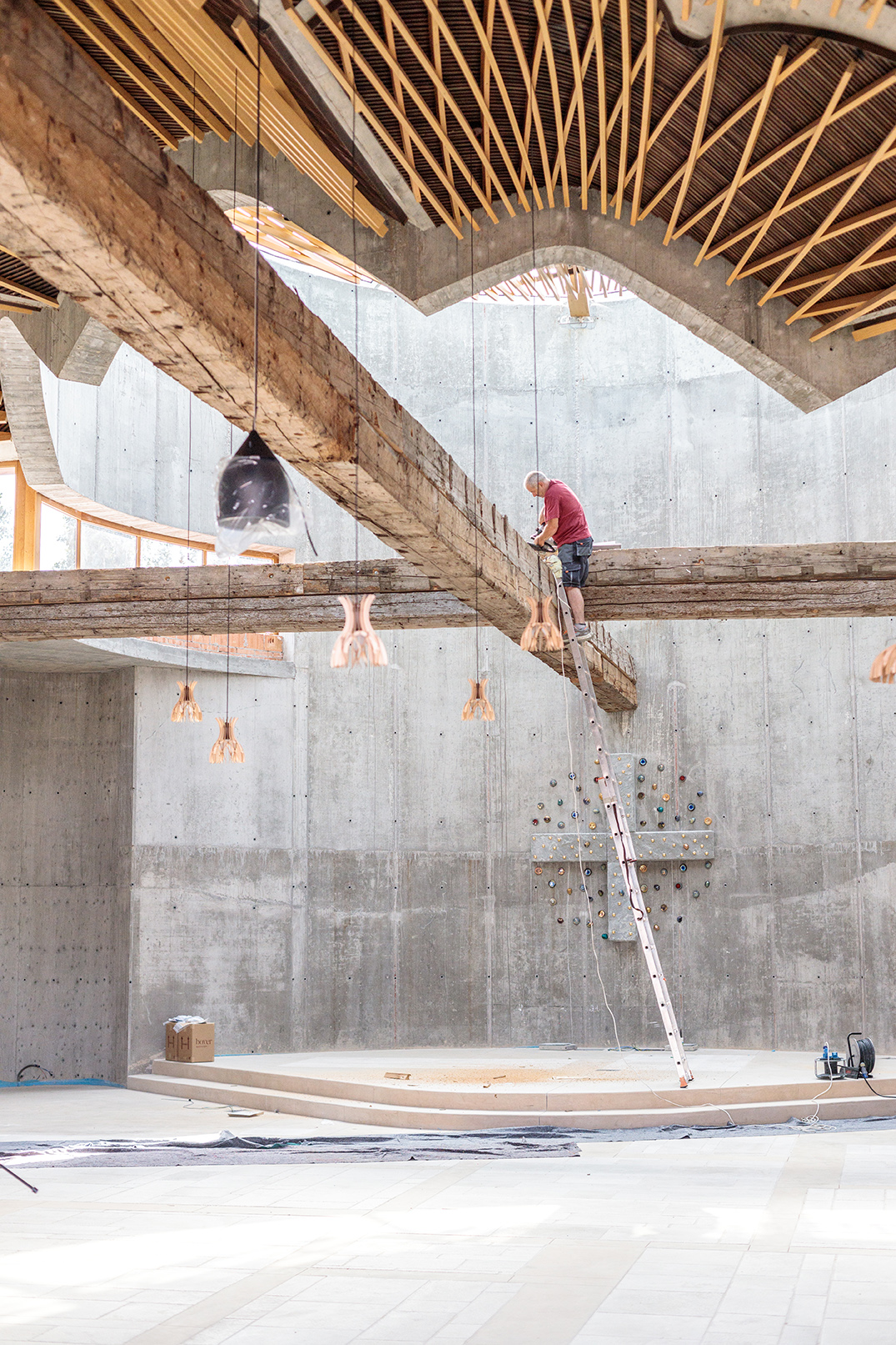 Il cuore della chiesa si caratterizza per un’imponente copertura voltata in legno che allude alle navate romaniche e gotiche e che si sviluppa a raggiera intorno ad un anello di luce che circonda un baldacchino sospeso, sorretto da una grande croce realizzata con travi antiche, recuperate dalla ristrutturazione del Municipio cittadino.