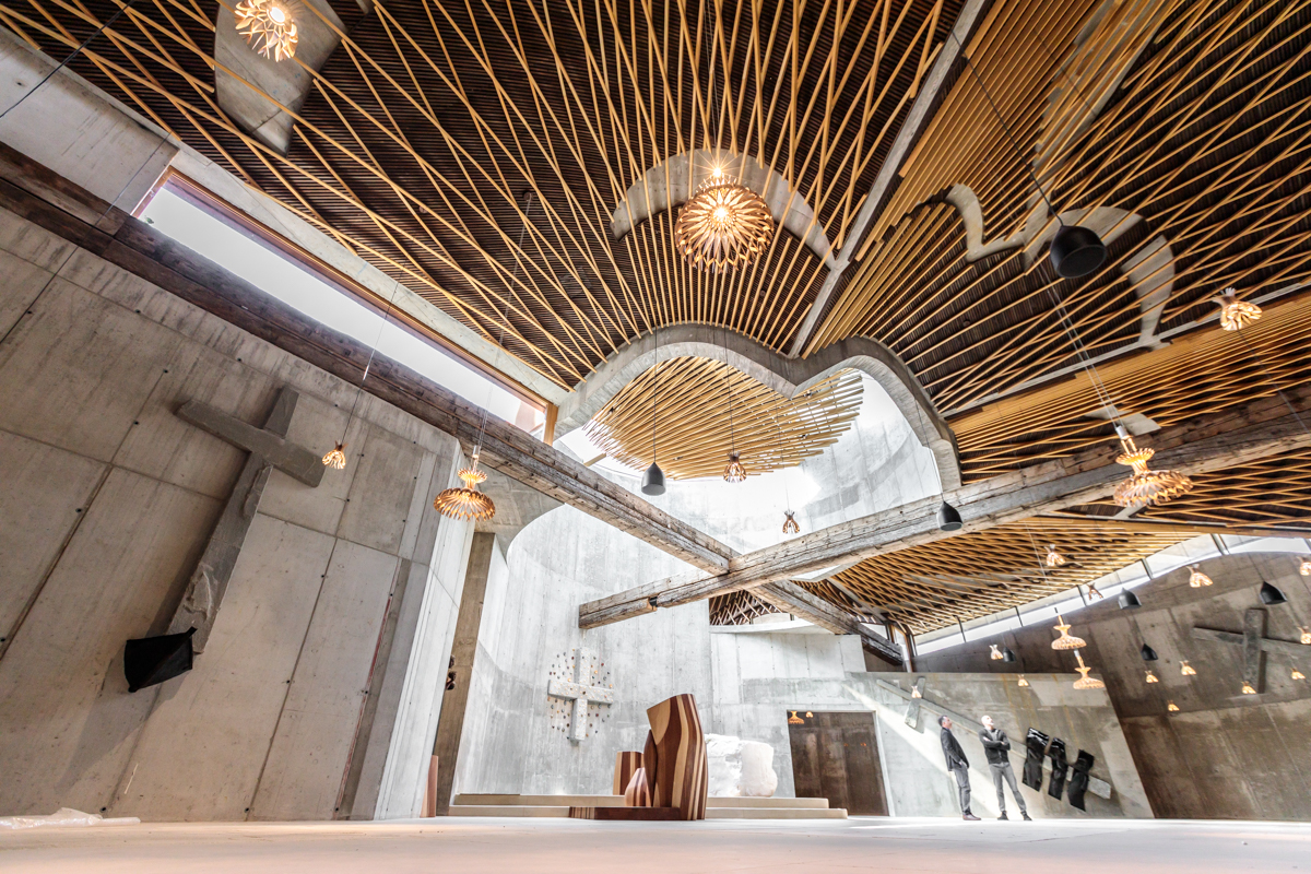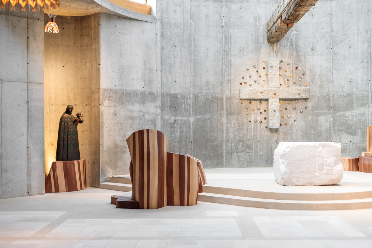 Lo spazio all’interno della chiesa è articolato, accogliente e inaspettatamente singolare per l’estetica, le forme ed i materiali utilizzati, un contrasto fondamentale per suscitare nei visitatori e nei fedeli un approccio vivo e dialogante con l’esperienza religiosa.