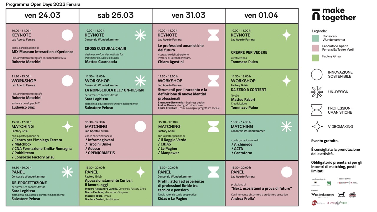 Make Together è il progetto che per la prima volta unisce i tre hub creativi di Ferrara Consorzio Factory Grisù, Laboratorio Aperto Ferrara e Consorzio Wunderkammer, assieme alla Cooperativa il Raggio Verde, Basso Profilo e Fondazione Giacomo Brodolini, nella creazione di una rete tra imprese, associazioni e pubbliche amministrazioni, per offrire e ricevere opportunità formative e di lavoro in modo innovativo a favore dei giovani 18-35 anni.