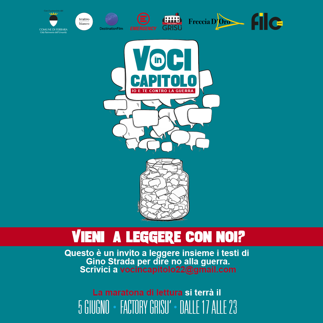 Per questo Emergency Ferrara, Progetto Teatro Bianco, Destination-APS Film e Factory Grisù, con il patrocinio del Comune di Ferrara, hanno deciso di organizzare una maratona di letture partendo dai testi di Gino Strada, Pappagalli Verdi, Una persona alla volta e Buskashi. Abbiamo chiamato questa iniziativa Voci in Capitolo perché avere voce in capitolo è la posizione di chi racconta le cose da una prospettiva consapevole e significativa, è una locuzione per indicare l’espressione di un punto di vista nella comunicazione e nella narrazione.