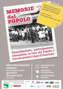 Biblioteca Bassani Via Grosoli 42, FerraraMEMORIE DAL POPOLO. Emancipazione, partecipazione, educazione: le Case del Popolo a Ferrara prima e dopo il Fascismo Mostra fotografica in collaborazione con…