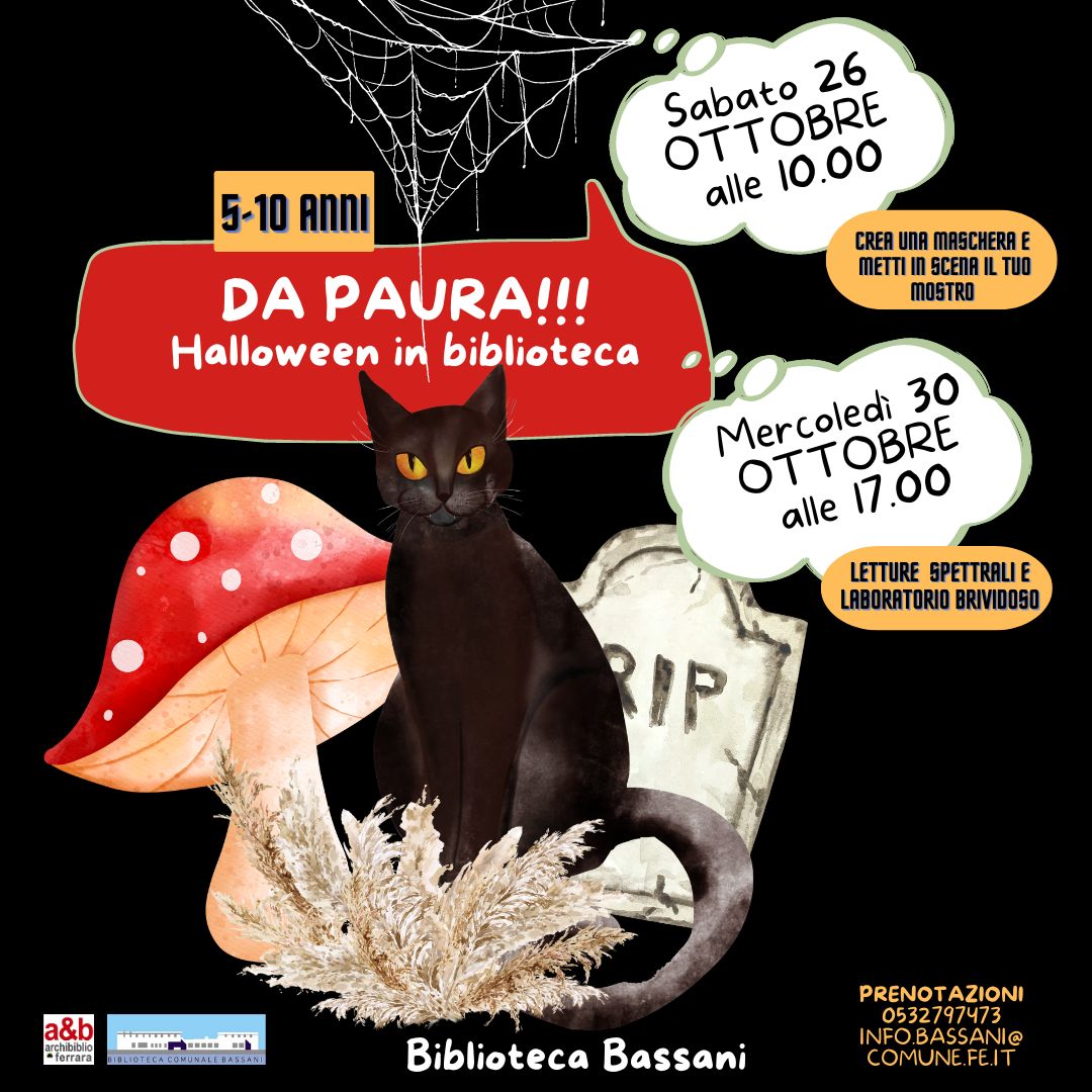 Biblioteca Comunale Bassani di FerraraLetture spettrali e laboratorio brividoso La notte più paurosa dell’anno si avvicina: cerchiamo bambini coraggiosi con denti affilati.…