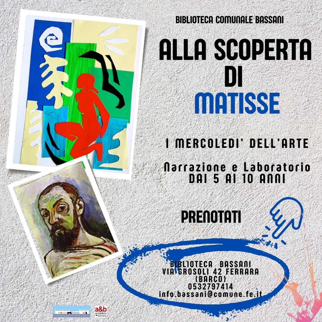 Biblioteca Comunale Bassani di FerraraI mercoledì dell'arte Conosceremo la storia di Henri Matisse immergendoci nei colori accesi delle sue opere. In compagnia di forbici…