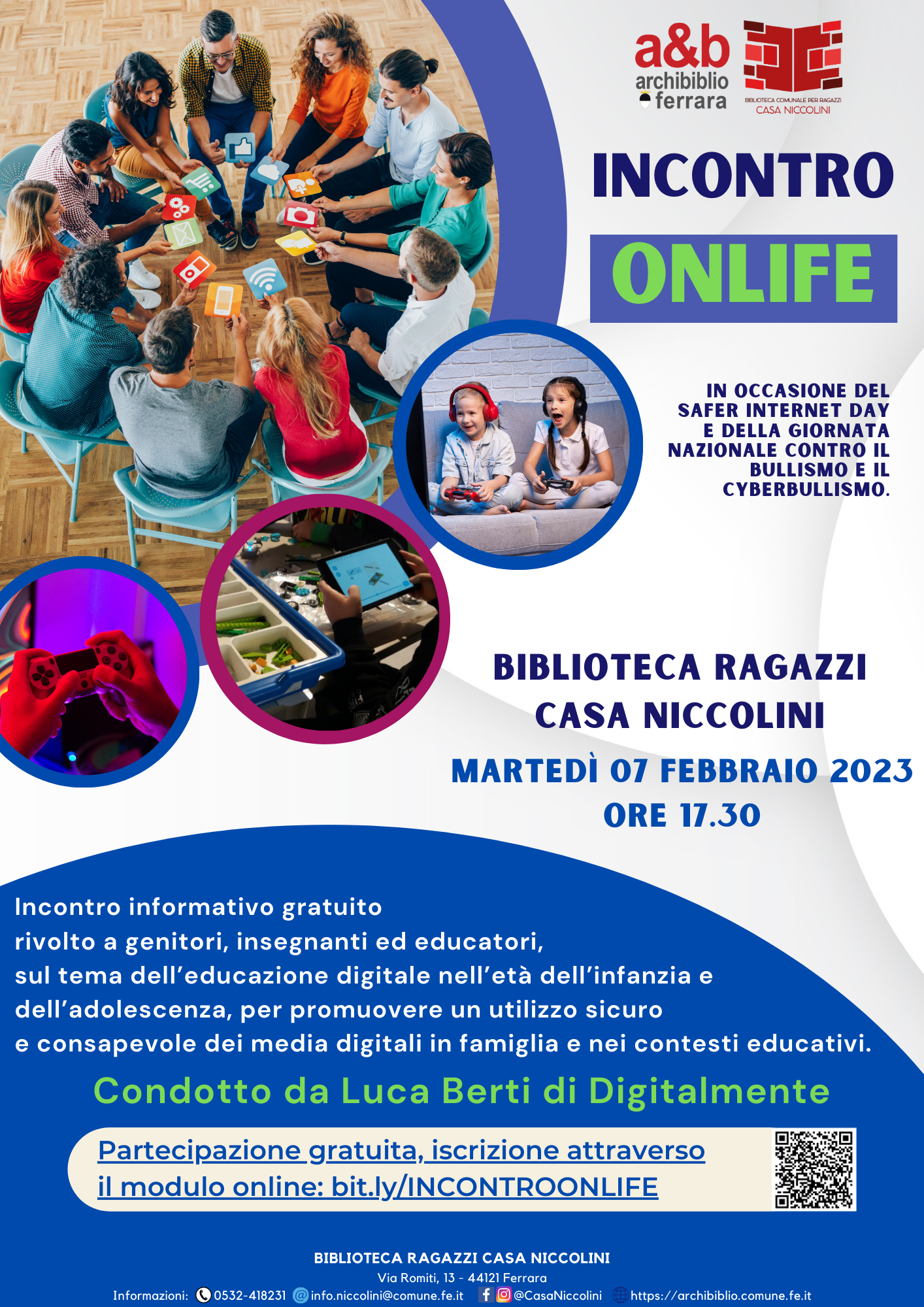 Biblioteca per ragazzi Casa Niccolini via Romiti, 13, Ferrara, Ferrara, ItaliaOnlife è un incontro informativo gratuito, rivolto a genitori, insegnanti ed educatori, sul tema dell’educazione digitale nell’età dell’infanzia…