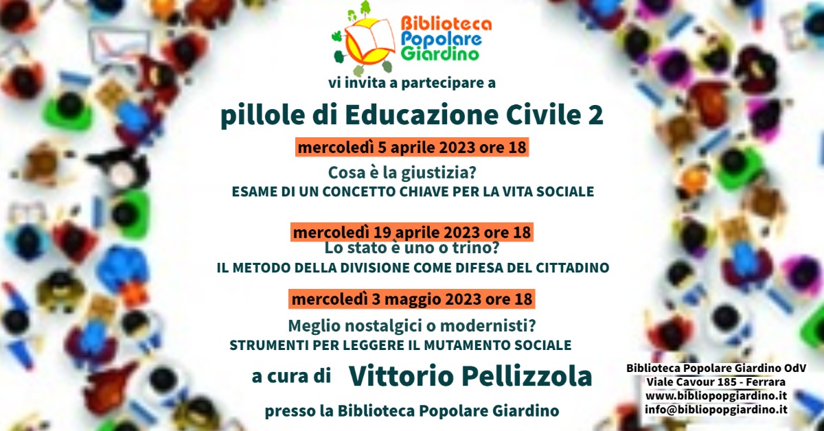 Biblioteca Popolare Giardino Odv Viale Cavour 189 (base del grattacielo), FerraraTre incontri di "Pillole di educazione civile "a cura di Vittorio Pellizzola presso la Biblioteca Popolare Giardino