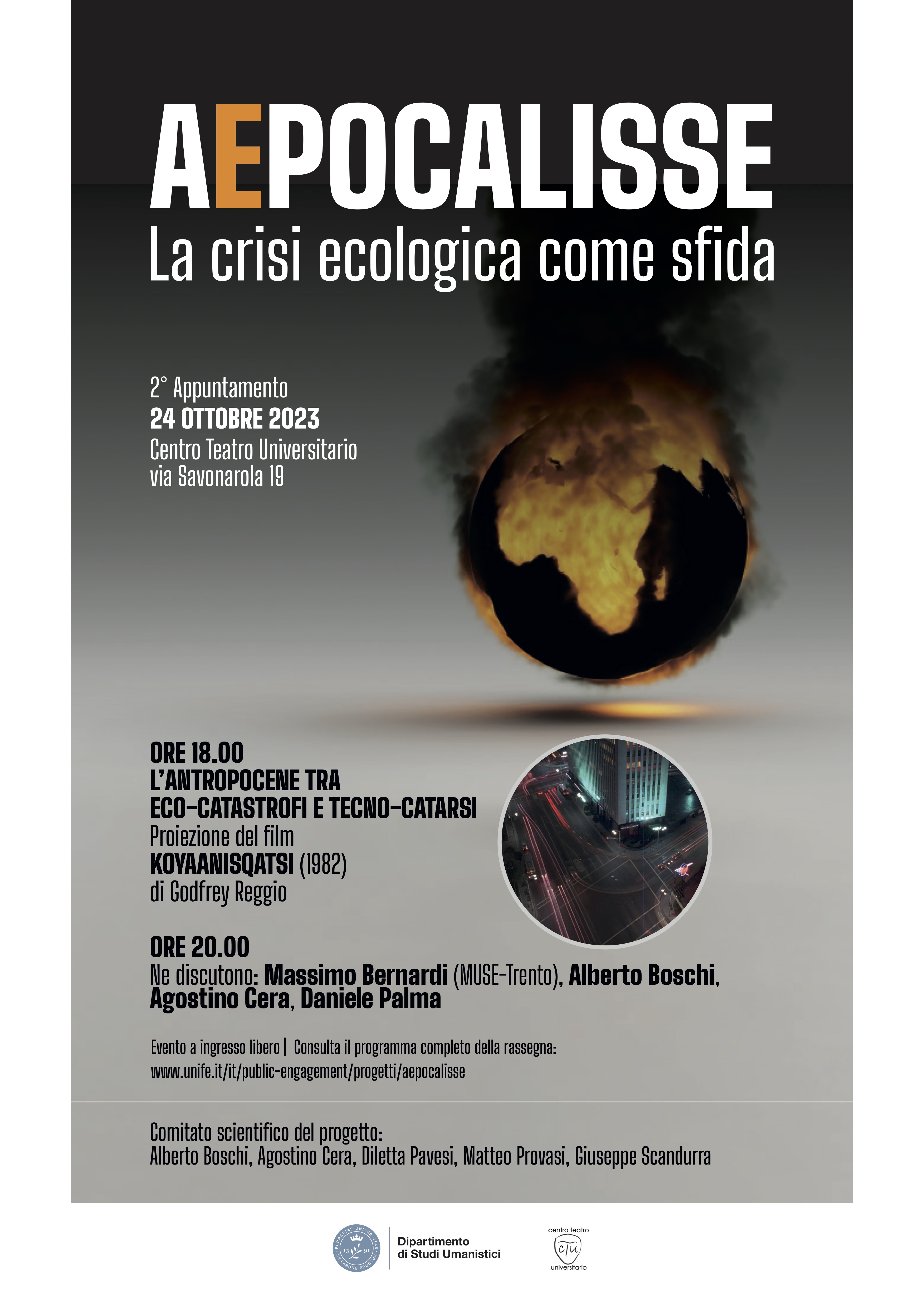 Centro Teatro Universitario di Ferrara Via Savonarola, 19, Ferrara, ItaliaORE 18.00 L’ANTROPOCENE TRA ECO-CATASTROFI E TECNO-CATARSI Proiezione del film KOYAANISQATSI (1982) di Godfrey Reggio ORE 20.00 Ne…