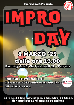 Consorzio Factory Grisù via Poledrelli 21, Ferrara, ItaliaDieci ore di improvvisazione teatrale, uno spettacolo ogni ora, in un'esplosione di creatività e divertimento, al Consorzio Factory Grisù.…