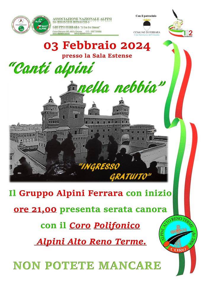 Sala Estense Piazza Municipio 14, Ferrara, Ferrara, Italia3 febbraio, ore 21.00 Sala Estense - Piazza Municipale Il Gruppo Alpini Ferrara presenta una serata canora con il Coro…