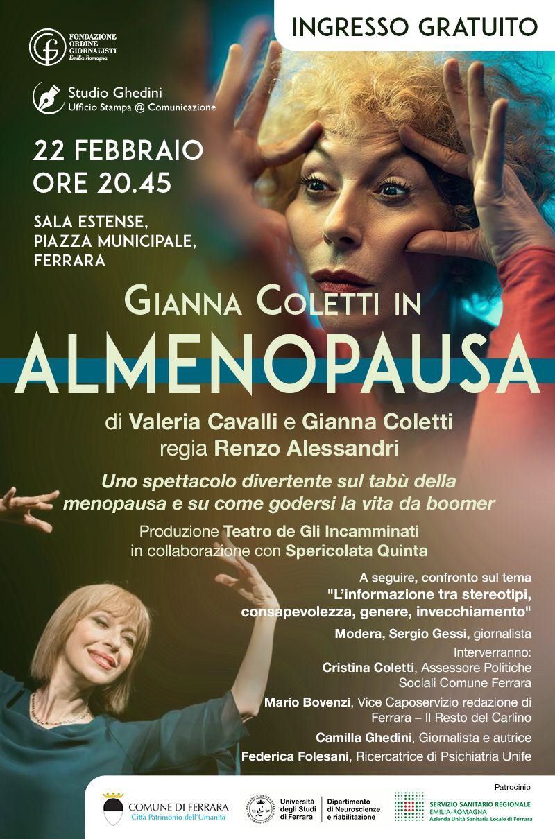 Sala Estense Piazza Municipio 14, Ferrara, Ferrara, Italia22 febbraio, ore 20.45 Gianna Coletti in Almenopausa di Valeria Cavalli e Gianna Coletti. Regia Renzo Alessandri Uno…