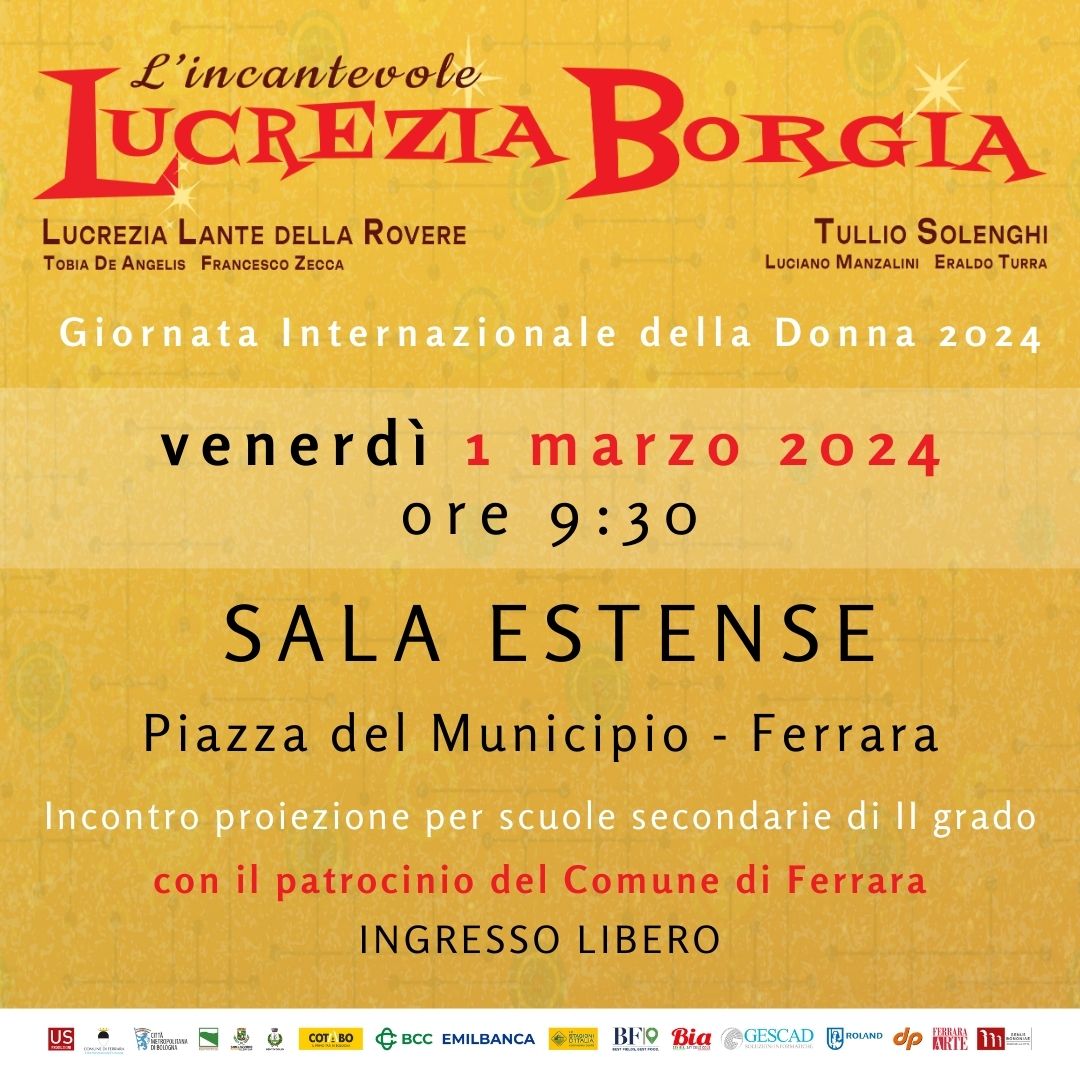 Sala Estense Piazza Municipio 14, Ferrara, Ferrara, ItaliaGiornata Internazionale della Donna 2024 Incontro e proiezione del film L'incantevole Lucrezia Borgia Venerdì 1 marzo 2024 dalle…