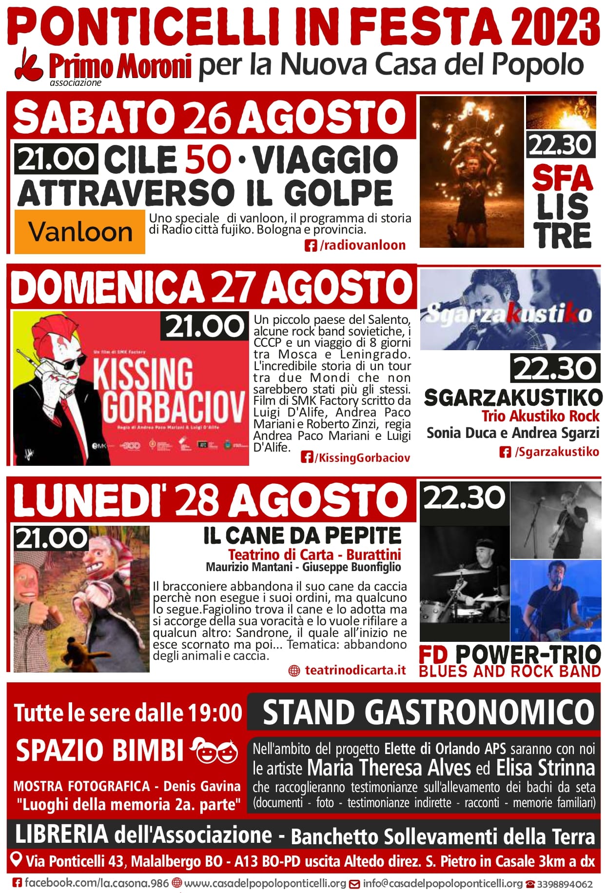 Nuova Casa del Popolo di Ponticelli via Ponticelli 43, Malalbergo, Bologna, ItaliaPROGRAMMA Sabato 26 AGOSTO: 21.00 - CILE 50. Viaggio attraverso il golpe. Uno speciale di Vanloon, il programma…