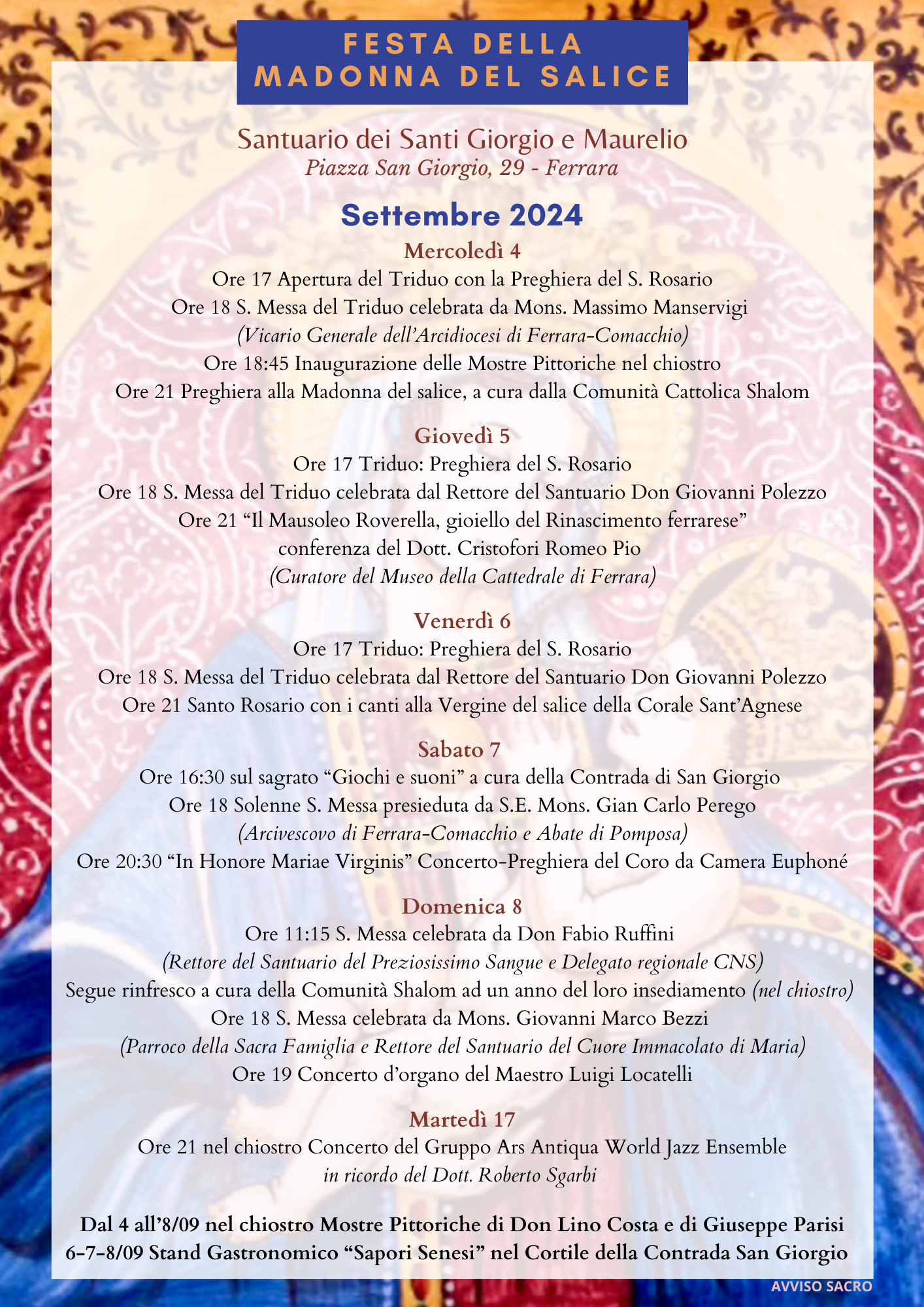 Parrocchia di San Giorgio Martire Piazzale San Giorgio, 29, FerraraTornano anche quest’anno i festeggiamenti in onore della Madonna del Salice, patrona dell’antico Borgo di San Giorgio fuori…