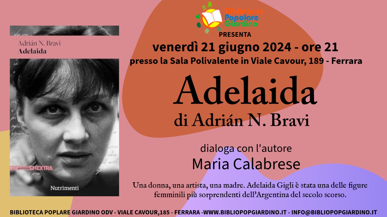 Sala Polivalente Grattacielo, viale Cavour 189 Ferrara, Ferrara, ItaliaLa Biblioteca Popolare Giardino È lieta di invitare alla presentazione del libro “Adelaida” di Adrián N. Bravi Libro…