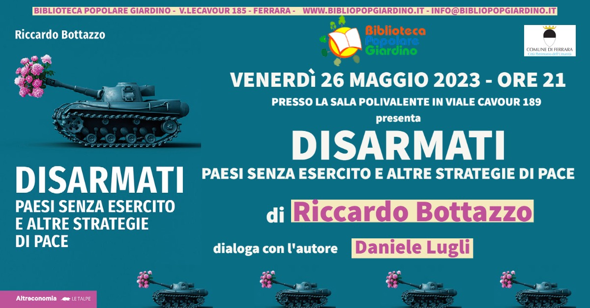 Biblioteca Popolare Giardino Viale Cavour n. 185 ( ai piedi del Grattacielo), FerraraDisarmati Paesi senza esercito e altre strategie di pace Un libro disarmante. Riccardo Bottazzo racconta l’incredibile storia dei…