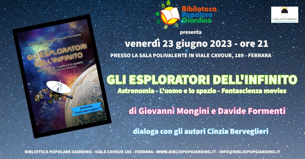 Biblioteca Popolare Giardino Viale Cavour n. 185 ( ai piedi del Grattacielo), FerraraLa Biblioteca Popolare Giardino invita Venerdì 23 giugno 2023 ore 21:00 Alla presentazione del libro “Gli esploratori dell'infinito…